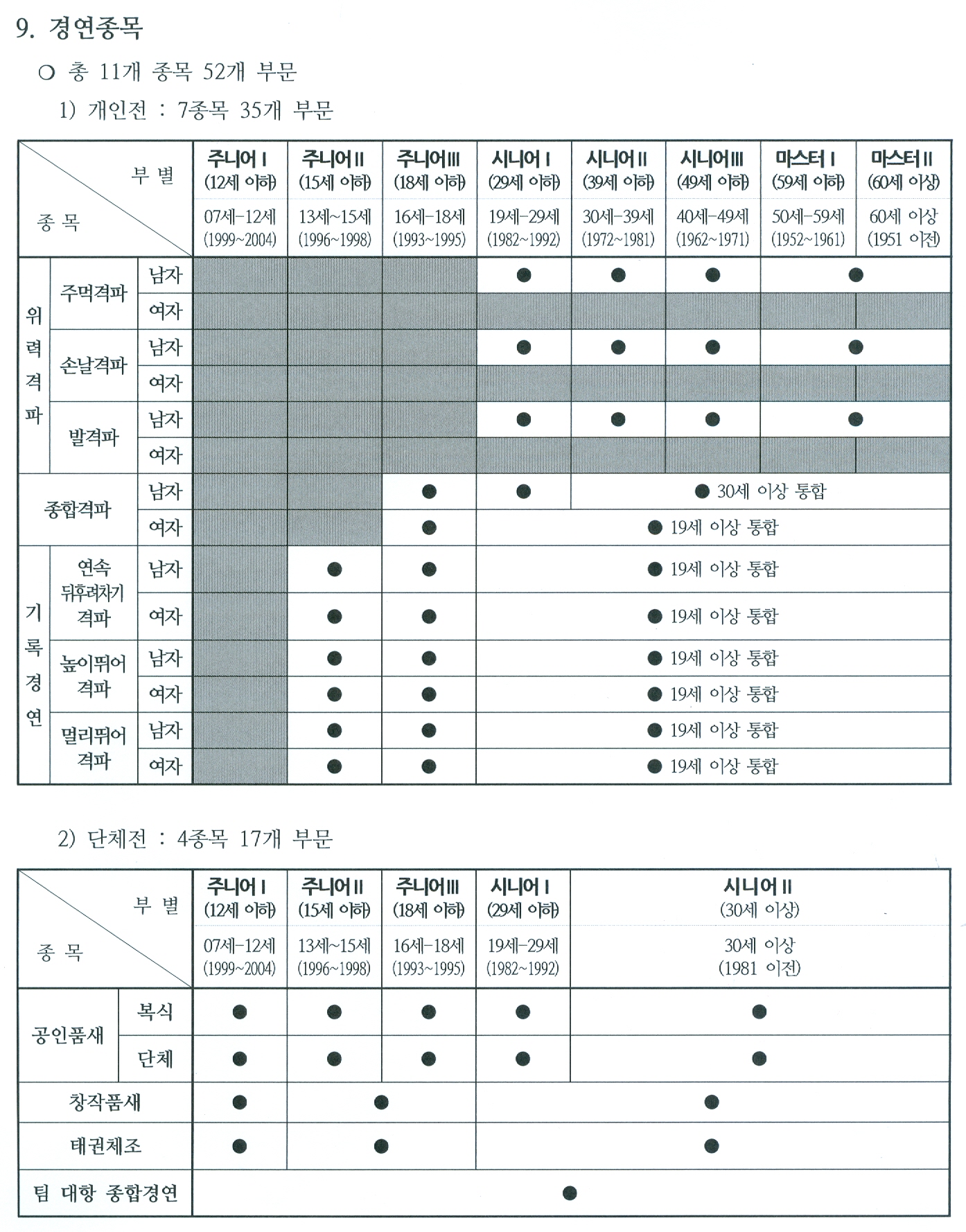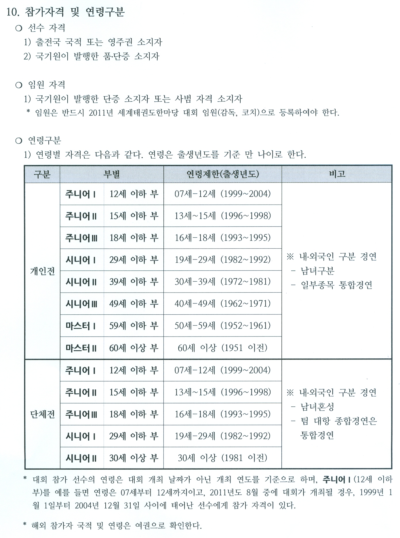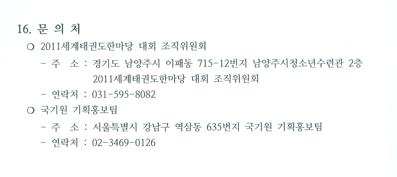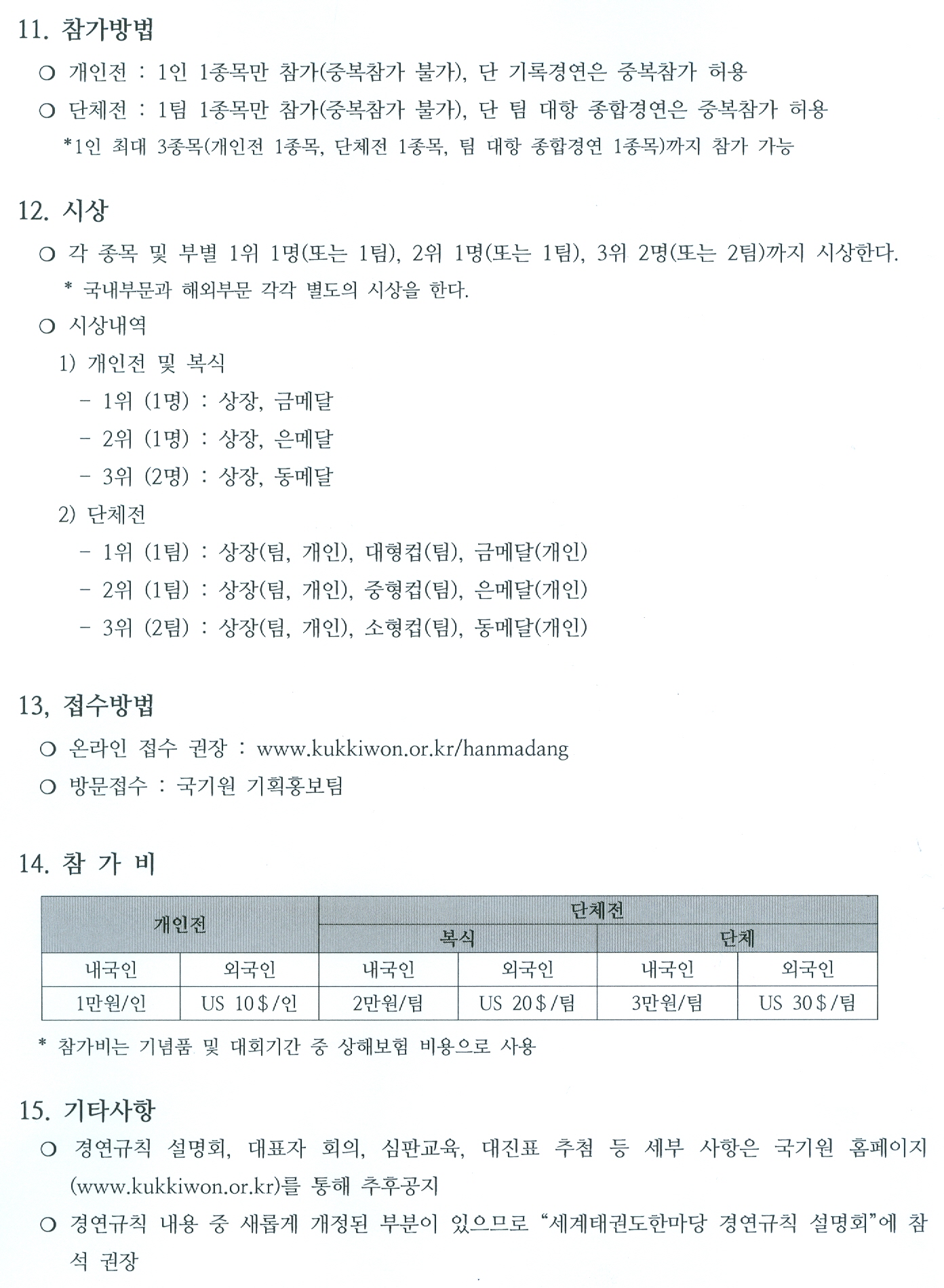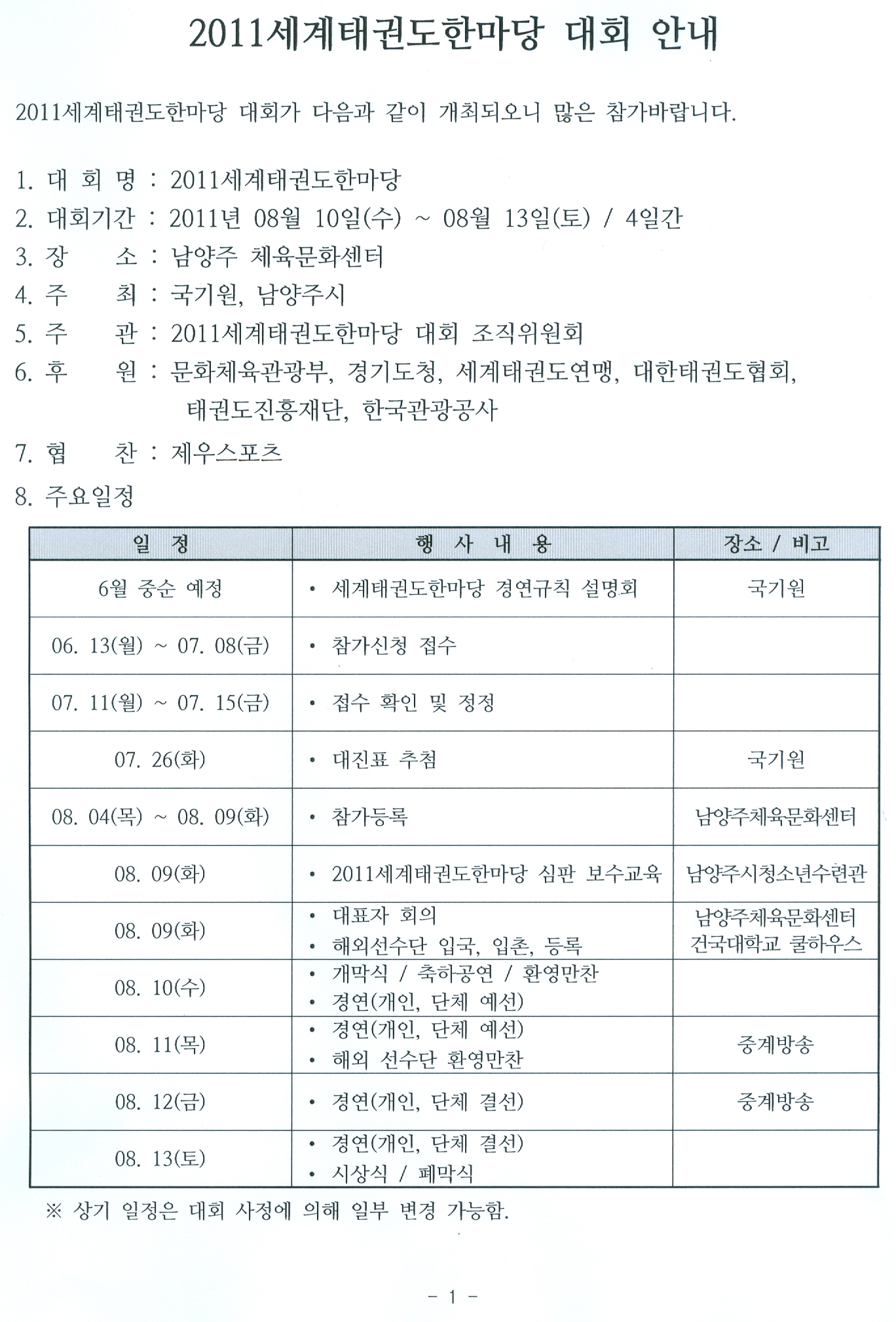 알림 2011 세계태권도한마당 안내 작성자 sesAdminId 작성일 2011-06-07 조회 8363 첨부 세계태권도한마당 대회요강 다운로드 참가신청서식 다운로드 목록 2011-06-03 2011년 미국파견인턴사범 교육 대상자 명단 2011-06-13 2011한마당 경연규칙설명회 안내