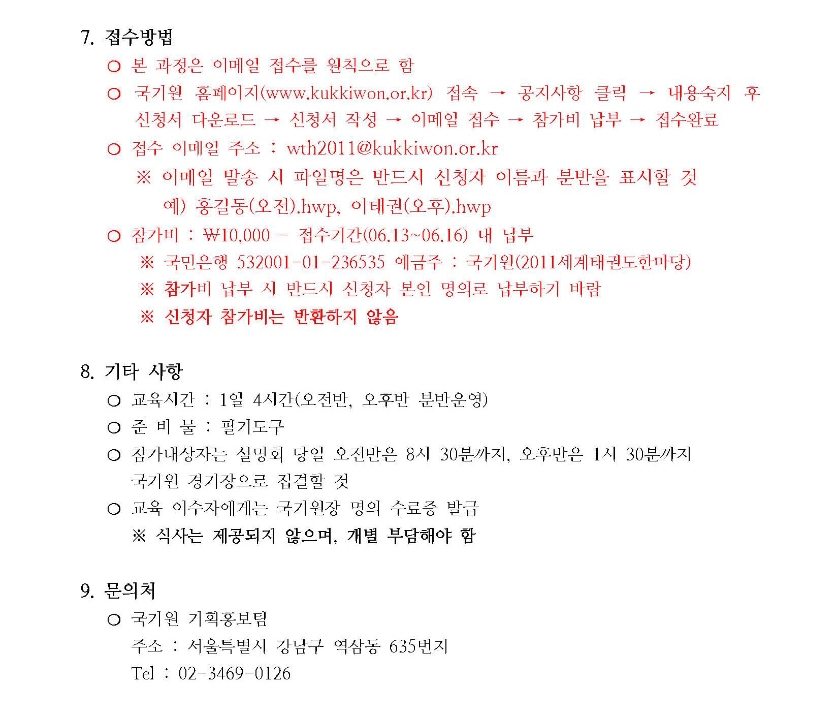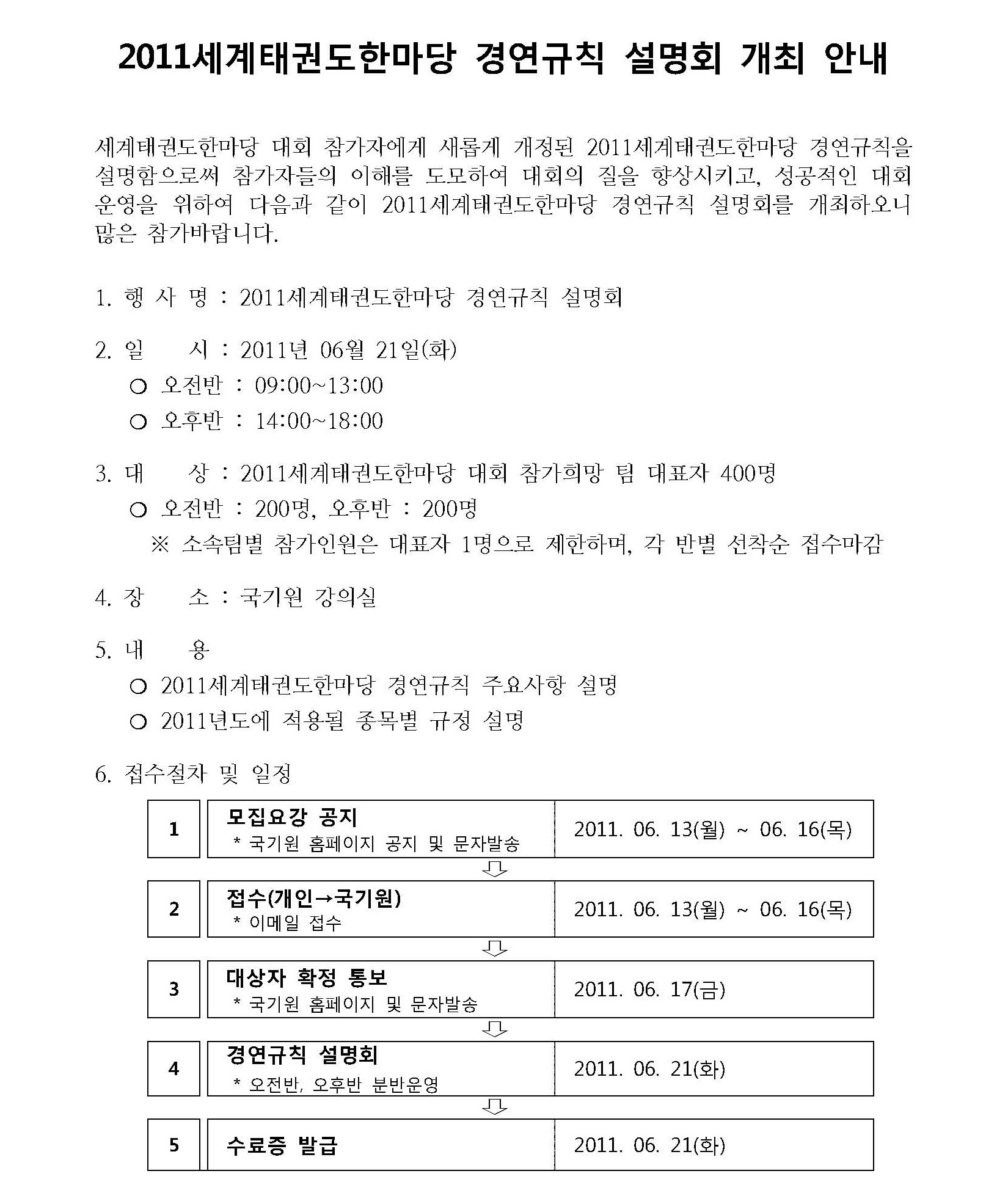 알림 2011한마당 경연규칙설명회 안내 작성자 sesAdminId 작성일 2011-06-13 조회 6458 첨부 경연규칙 설명회 신청서 다운로드 목록 2011-06-07 2011 세계태권도한마당 안내 2011-06-14 2011년 한마당 심판교육과정안내
