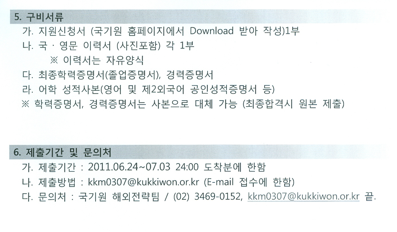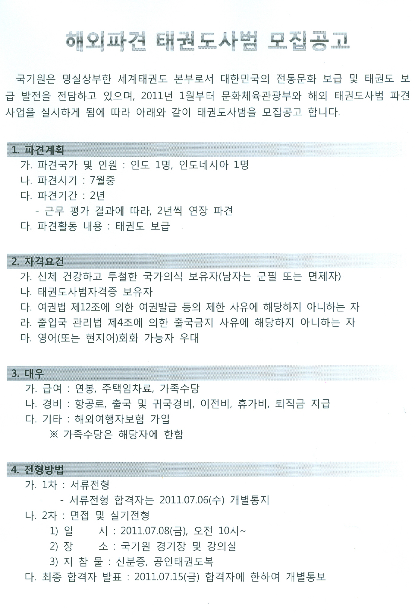 알림 2011년 해외파견 태권도사범 모집공고 작성자 sesAdminId 작성일 2011-06-24 조회 8628 첨부 해외파견 사범 지원신청서 다운로드 목록 2011-06-23 2011년 미국파견 태권도인턴사범 최종 합격자 2011-06-27 2011년도 1,2,3급 세계태권도한마당심판 연수대상자발표 안내