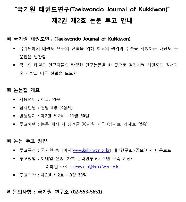 알림 [공지사항] "국기원 태권도연구(Taekwondo Journal of Kukkiwon)" 제2권 제2호 논문 투고 안내 작성자 sesAdminId 작성일 2011-07-12 조회 7307 첨부 목록 2011-07-12 국기원 미국파견 인턴사범 임명식 및 소양교육 안내 2011-07-13 2011세계태권도한마당 심판 선발공고