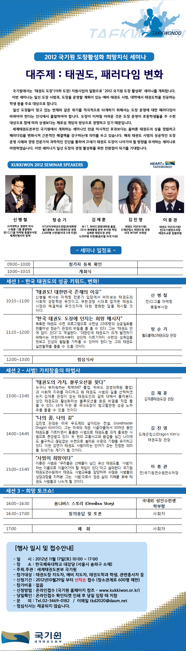 알림 2012국기원 도장활성화 희망지식세미나 접수안내 작성자 sesAdminId 작성일 2012-10-26 조회 3782 첨부 접수신청하기(클릭) 목록 2012-10-16 167기 사범자격증 발송 안내입니다. 2012-11-06 대학수학능력시험 관련 업무시간 조정 안내