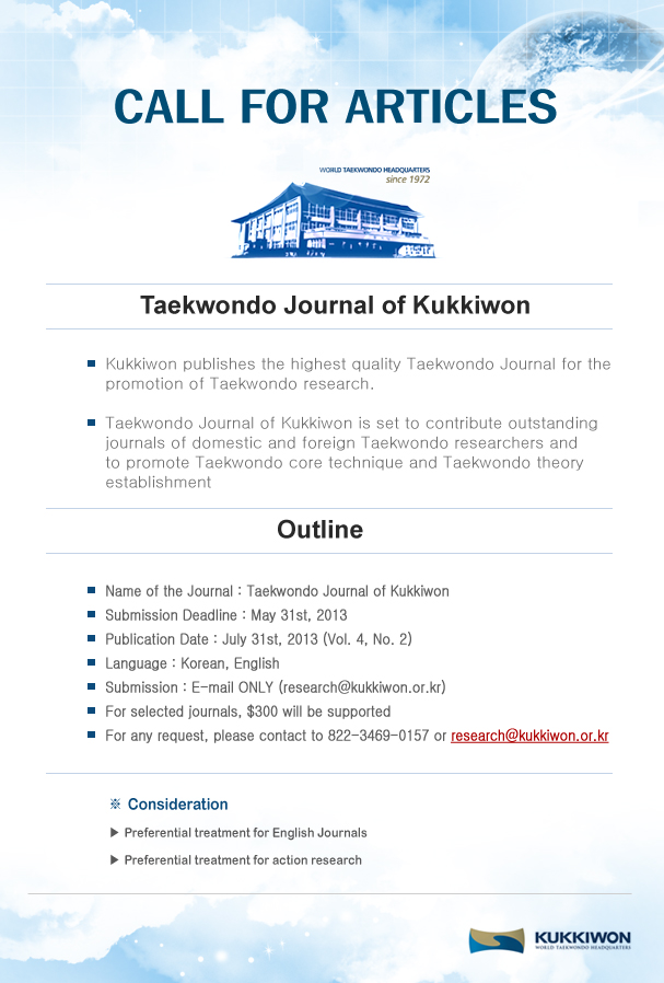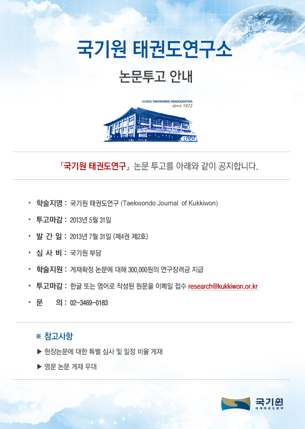 알림 국기원 태권도연구소 논문투고 안내 작성자 sesAdminId 작성일 2013-05-07 조회 3053 첨부 논문투고지침 다운로드 논문 편집양식 (국문) 다운로드 논문 편집양식 (영문) 다운로드 목록 2013-05-07 제170기 3급사범 교육안내 2013-05-13 석가탄신일 휴무 알림