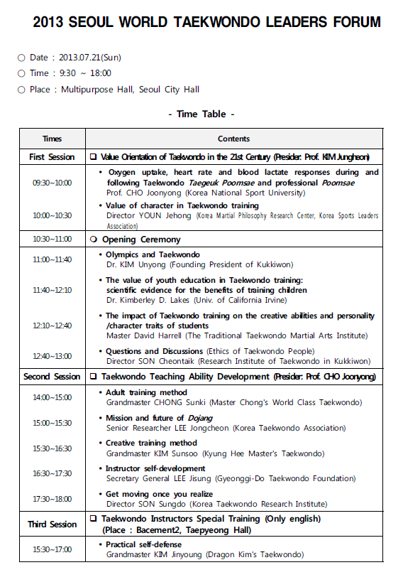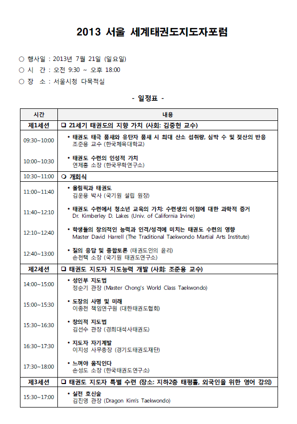 알림 2013 서울 세계태권도지도자포럼 제2세션 지도능력 개발 자료집 작성자 sesAdminId 작성일 2013-07-19 조회 3746 첨부 2013 서울 세계태권도지도자포럼 지도능력개발마당 자료집 다운로드 목록 2013-07-16 2013 서울 세계태권도지도자포럼 2013-07-19 2013 서울 세계태권도지도자포럼 제1세션 21세기 태권도의 지향가치 자료집