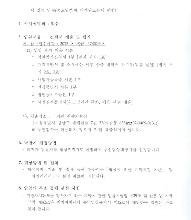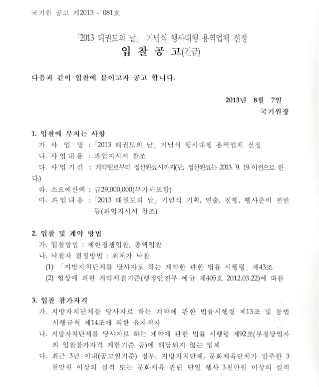 알림 2013 태권도의 날 기념식 행사대행 용역업체 선정 입찰공고 작성자 sesAdminId 작성일 2013-08-07 조회 4420 첨부 과업지시서 다운로드 별지서식 다운로드 목록 2013-07-19 2013 서울 세계태권도지도자포럼 제1세션 21세기 태권도의 지향가치 자료집 2013-08-08 광복절 휴무 알림
