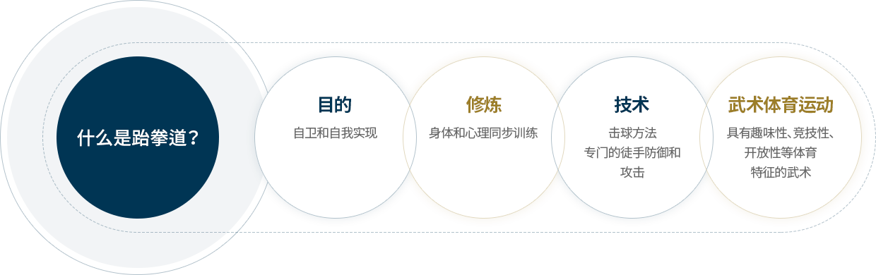 跆拳道是一项以防身、自我实现为目的,修炼以击打为主要攻击手段的徒手防御和攻击技术的武术体育运动。该定义包括了武术体育运动四要素,即跆拳道的目的、技术、修炼和自我理解。